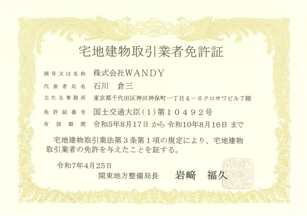 WANDYは、国土交通省認可の宅建業者です。